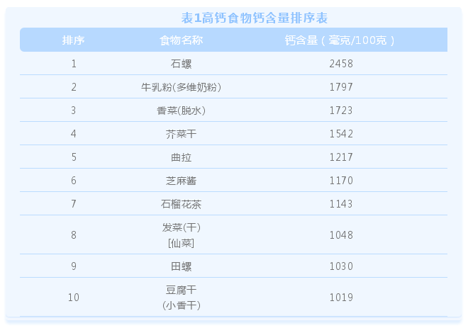 其實(shí)奶的鈣含量并不高,例如山羊奶的含量為95毫克/100克,綿羊奶為230毫克/100克,牛奶為120毫克/100克,人奶更低只有30毫克/100克。事實(shí)上,如果與其他食物相比較,可以發(fā)現(xiàn)牛奶里的鈣含量并不高,甚至連“較高”和“稍高”都算不上,所有哺乳動物的奶包括人乳,都無法與螺肉的鈣含量相比較。它的鈣含量高達(dá)2458毫克/100克,是牛奶中鈣含量的20多倍,見下表1(表1高鈣食物鈣含量排序表)[食物營養(yǎng)成分網(wǎng).食物營養(yǎng)成分表查詢[EB/OL]. http://yingyang.00cha.com/.]。