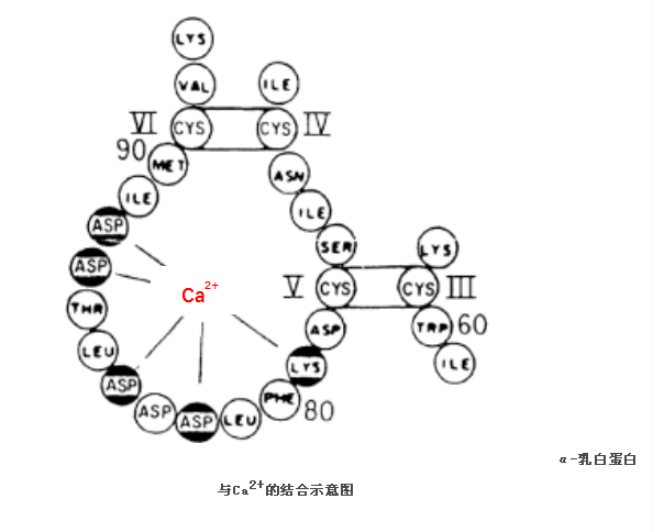 因此,補(bǔ)鈣******牛奶及其制品是有科學(xué)依據(jù)的。之所以奶及奶制品能夠?qū)崿F(xiàn)******補(bǔ)鈣,顯然并非由于奶及奶制品中鈣的含量比其它食物高。除了上述酪蛋白磷酸肽,乳清蛋白里的α-乳白蛋白也是一種典型的金屬結(jié)合蛋白,對于正2價陽離子結(jié)合力強(qiáng)。它是由123個氨基酸構(gòu)成,由于二級結(jié)構(gòu)的螺旋、折疊等原因,其中四個天冬氨酸(Aps)殘基處在非常特殊的位置,空間構(gòu)象形成一個“口袋陷阱”。理論上每個“口袋陷阱”可以“攫取”一個鈣離子,如“圖 α-乳白蛋白與Ca2+的結(jié)合示意圖”所示[P. F. Fox, T. Uniacke-Lowe,P. L. H. McSweeney, J. A. O’Mahony. Dairy chemistry and biochemistry(second edition)[M].Springer International Publishing Switzerland, 2015.] 。