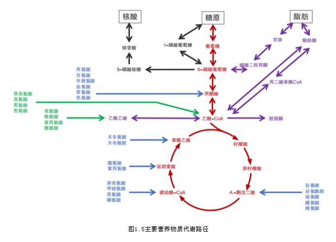 按照傳統(tǒng)的營(yíng)養(yǎng)學(xué)理論,動(dòng)物機(jī)體一般營(yíng)養(yǎng)物的消化吸收規(guī)律是:“消化、吸收、重組、運(yùn)送(到需要之處)”等過(guò)程,詳情見(jiàn)“圖1.5主要營(yíng)養(yǎng)物質(zhì)代謝路徑”。