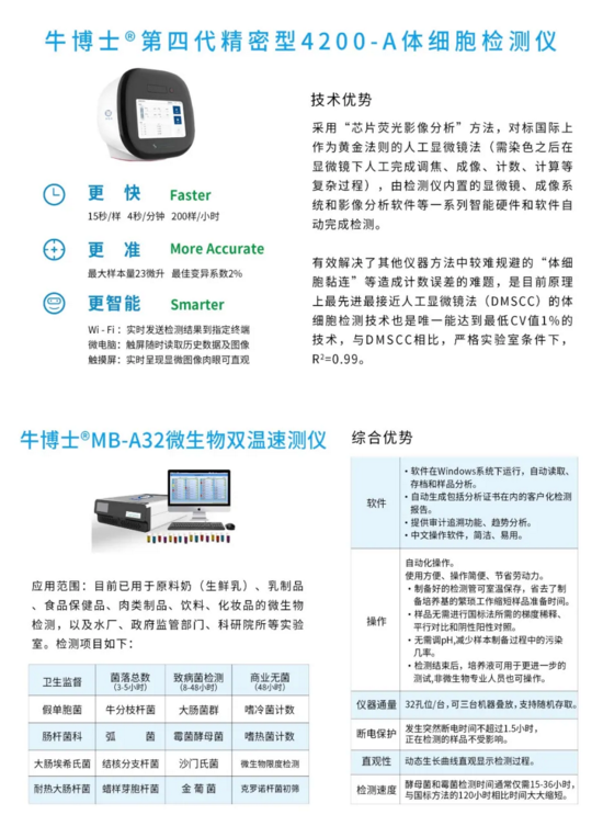 牛博士®第四代精密型體細(xì)胞檢測(cè)儀,其前身是明星產(chǎn)品牛博士®Ⅲ型體細(xì)胞檢測(cè)儀,是檢測(cè)原奶質(zhì)量安全的******選擇;牛博士®MB-A32微生物雙溫速測(cè)儀,其檢測(cè)范圍廣:菌落總數(shù)、商業(yè)無(wú)菌、霉菌酵母菌、大腸桿菌、腸桿菌科、嗜冷菌計(jì)數(shù)等。產(chǎn)品1+1組合是實(shí)驗(yàn)室******組合。