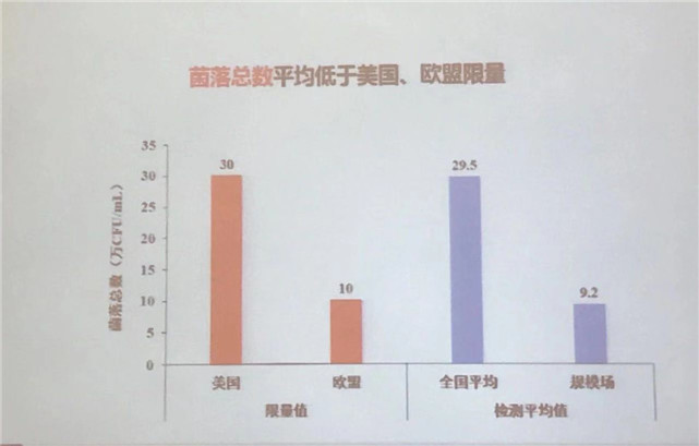 2018年規(guī)模養(yǎng)殖場(chǎng)體細(xì)胞監(jiān)測(cè)數(shù)據(jù)為22.1萬(wàn)個(gè)/mL,顯著低于美國(guó)75.0萬(wàn)個(gè)/mL、歐盟40.0萬(wàn)個(gè)/mL的標(biāo)準(zhǔn);2018年規(guī)模養(yǎng)殖場(chǎng)******數(shù)監(jiān)測(cè)數(shù)據(jù)為7.2萬(wàn)CFU/mL,顯著低于美國(guó)30.0萬(wàn)CFU/mL、歐盟10.0萬(wàn)CFU/mL的標(biāo)準(zhǔn);乳蛋白抽檢平均值3.25g/100g,比2012年提高0.09g/100g,高出國(guó)家標(biāo)準(zhǔn)0.45g/100g;乳脂肪抽檢平均值3.84g/100g,比2012年提高0.25g/100g,高出國(guó)家標(biāo)準(zhǔn)0.74g/100g;反映牛奶衛(wèi)生狀況的生鮮乳菌落總數(shù)為29.5萬(wàn)CFU/mL,比2013年降低了35.1萬(wàn)CFU/mL。