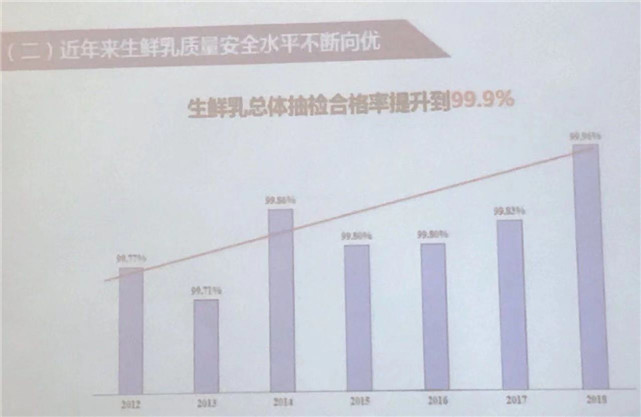 2018年,生鮮乳抽檢合格率99.9%,同比提高0.1個(gè)百分比。三聚氰胺等違禁添加物抽檢合格率連續(xù)多年保持在100%。