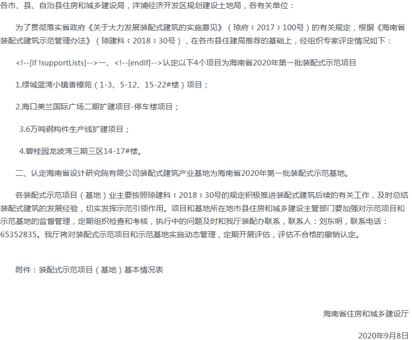 海南省住房和城鄉(xiāng)建設(shè)廳 關(guān)于認(rèn)定海南省2020年第一批裝配式示范項(xiàng)目和示范基地的通知