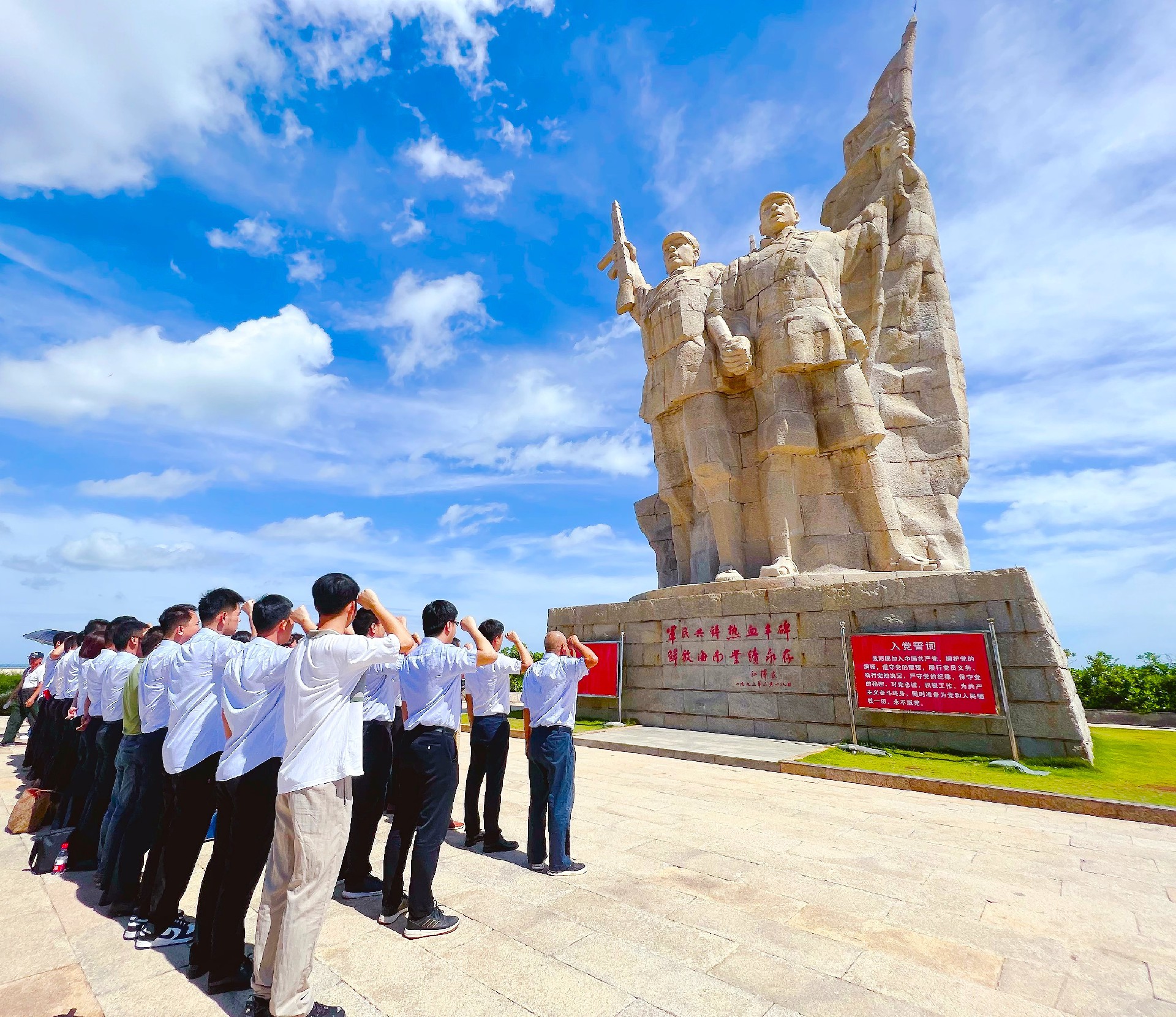 在臨高角解放海南紀(jì)念雕像前,全體人員面向豐碑雕像行三鞠躬禮并瞻仰,寄托對(duì)革命先烈的深切哀思,表達(dá)對(duì)革命先烈的無(wú)限崇敬之情。隨后,由公司黨委書記劉圳濱領(lǐng)誓,在場(chǎng)全體黨員、預(yù)備黨員高舉右拳,面對(duì)鮮紅黨旗,莊嚴(yán)宣誓,追憶入黨初心,一聲聲鏗鏘有力的誓言響徹現(xiàn)場(chǎng),展現(xiàn)了大家愛(ài)黨敬黨的激情。